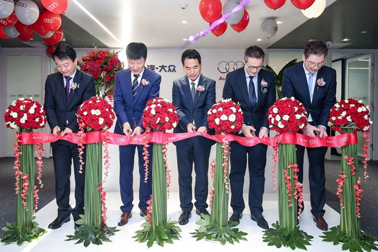 一汽-大众汽车有限公司董事、总经理张丕杰(中),一汽-大众奥迪销售事业部总经理任思明、执行副总经理荆青春等为市场部北京办公室落成剪彩