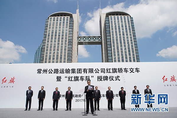 新华网北京9月18日电 近日,常州公路运输集团有限公司红旗轿车交车暨“红旗车队”授牌仪式在常州正式举行。中国一汽向常州公路运输集团有限公司交付了100辆1.8T新红旗H7作为服务用车。