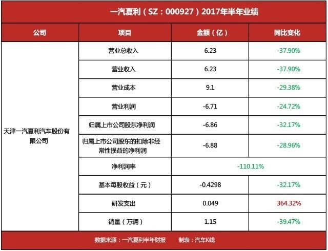 一汽夏利半年财报显示,其上半年营业收入为6.23亿元,同比下滑37.9%;归属上市公司股东净利润为亏损6.86亿元,比去年同期亏损扩大32.17%;上半年销量为1.15万辆,同比下滑39.47%。
