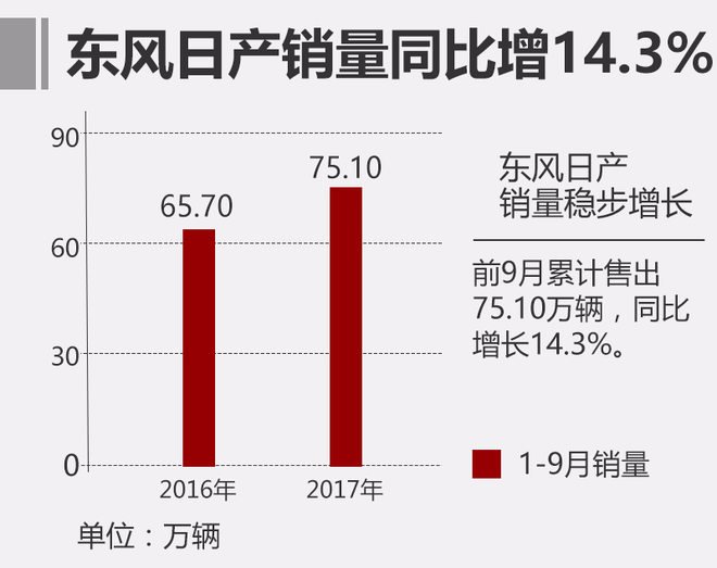 东风日产2017年的市场表现保持着稳定的增长势头,9月份终端、批发量均超过10万辆,其中批发量110,272辆,同比增长7%;1-9月份批发销量达到752,696辆,同比增长11.8%。截止到9月份,东风日产已经完成年销108万目标的69.5%。要想完成目标,东风日产需要在接下来的三个月中,月均销量超过11万辆。