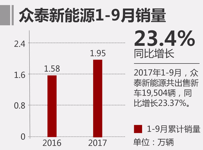 众泰新能源销量在9月表现抢眼,单月销量为2,504辆,环比增长94.56%。并且1-9月累计销售新车19,504辆,与去年同期销量相比,增长23.37%。众泰汽车将继续深耕新能源汽车市场,到2020年新能源汽车占比将达60%以上。