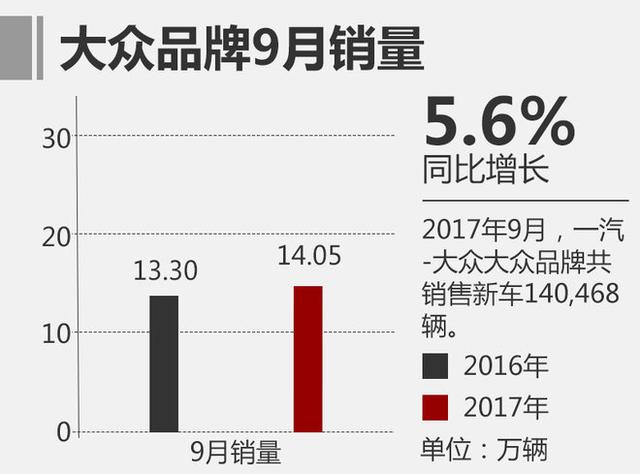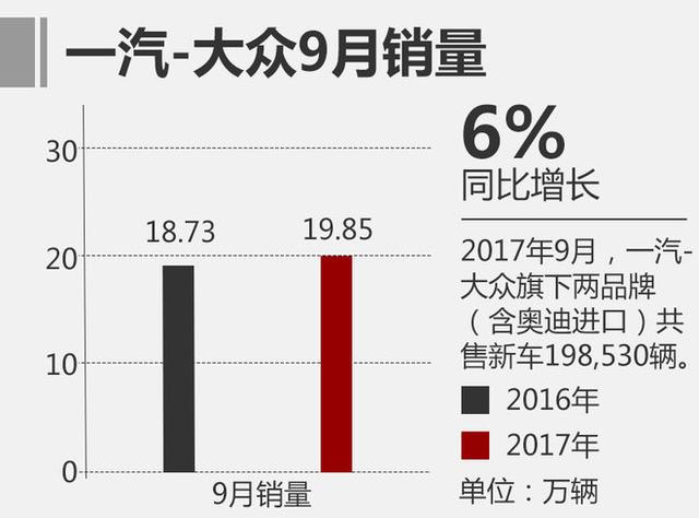 在刚刚过去的9月份,一汽-大众终端销量达到198,530辆(含奥迪进口车),相比去年同期的187,292辆增长6.0%。其中,大众品牌销售新车140,468辆,同比增长5.6%;奥迪品牌2016年9月共售出54,213辆新车,2017年同期相比增长7.1%,达到58,062辆。
