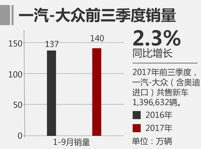 据统计,今年1-9月份,一汽-大众累计终端销量1,396,632辆(含奥迪进口车),相比去年同期1,365,232辆增2.3%。
