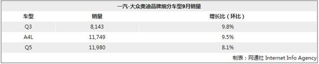 奥迪品牌,热销SUV Q3 9月销售新车8,143辆,环比增长9.8%;全新A4L销量同时突破1.1万辆,环比增9.5%;奥迪Q5(参配、图片、询价)的表现同样突出,9月份销售新车11,980,环比增长8.1%。此外,奥迪A6L(参配、图片、询价)和奥迪A3(参配、图片、询价) 在9月分别销售新车12,533辆和7,897辆。