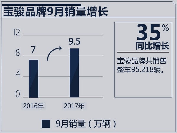 2016年,宝骏累计销售76万辆,同比增长51%。今年,乘用车市场增速放缓,宝骏品牌增势不减,到了“金九银十” 的车市销售旺季,再创新高,9月共销售新车95,218辆,同比大涨35%。1-9月,宝骏累计销量已达639,109辆。