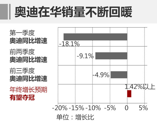 奥迪去年的全年总销量为591,554辆,想要突破60万辆,就要完成超过1.42%的全年增速,对比从一季度的-18.1%、前两季度的-9.1%,再到如今(前三季度)的-4.9%的变化,奥迪的回暖速度惊人,想要再次问鼎还需要靠后三个月与经销商一起努一把力,来实现目标。