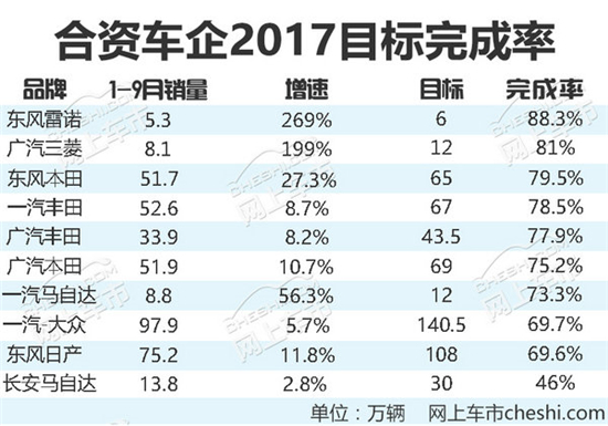 2017年整体乘用车市场表现较为疲软。时间如白驹过隙,转眼间已进入第四季度,年初放出“狠话”的车企们如今销量完成情况如何呢?网上车市梳理2017年十大合资车企1-9月销量后发现,近半数车企销量完成率未达75%,其中长安马自达的销量完成率仅为46%。