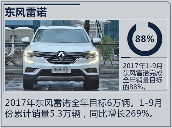2017年东风雷诺定下的全年目标为6万辆。1-9月份东风雷诺累计销售新车53,454辆,同比劲增269%,完成全年6万目标的88.3%,成为上榜企业完成率最高的一家。其中作为销售主力的全新一代科雷傲1-9月份累计售出新车34,925辆,此外科雷嘉也为东风雷诺贡献了18,529辆的销量。