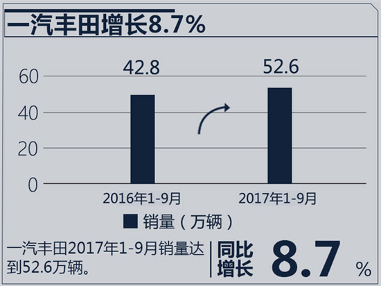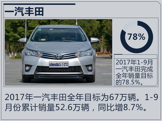 2017年一汽丰田的销量目标为67万辆。一汽丰田自成立以来,累计销量突破600万辆里程碑。1-9月,一汽丰田累计销量已经突破52.6万辆,完成全年目标的78.5%。紧凑型轿车卡罗拉月均销量接近3万辆,成为国内轿车销量TOP5常客。