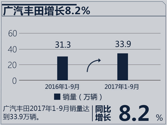 2017年广汽丰田制定的销量目标为43.5万辆,低于去年全年43.7万辆的销量。广汽丰田2017年9月实现终端销量40,985辆;1-9月累计销量33.9万辆,同比增长8.2%。得益于紧凑型轿车雷凌和中型SUV汉兰达的出色表现,广汽丰田完成了全年销量目标的77.9%。此外,第八代凯美瑞也将于11月上市。