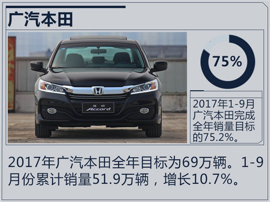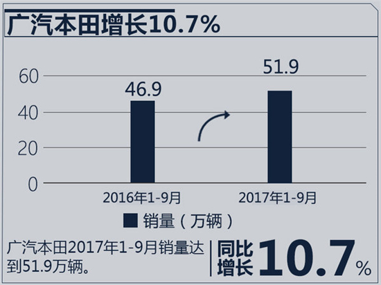 2017年广汽本田的销量目标为69万辆。1-9月份广汽本田累计销量达51.99万辆,同比增长10.7%,完成全年销量目标的75.2%。9月份雅阁、凌派、缤智三箭齐发,纷纷突破万辆大关,此外中型SUV冠道也以超过9,000辆的销量成为广汽本田销量增长新势力。