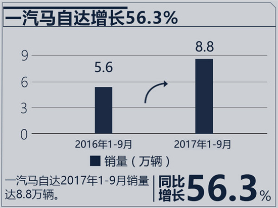 2017年一汽马自达制定的全年销量为12万辆。1-9月份累计完成销量88,694辆,同比大涨56.3%,完成全年销量目标的73.3%。一汽马自达旗下的轿跑SUV CX-4和中型轿车阿特兹9月销量分别为6,769和4,300辆。