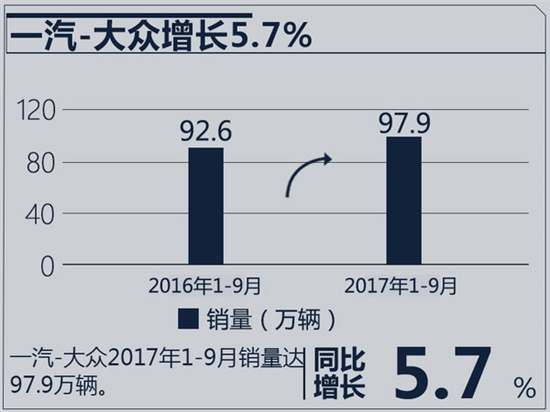 上榜企业中最有“野心”的一汽-大众2017年销量目标为140.5万辆。前9月一汽-大众旗下的大众品牌累计销量达97.9万辆,同比增长5.7%,已实现全年销量目标的69.7%。全新迈腾、A+级轿车速腾长期占据各自细分市场的冠军宝座,成为一汽-大众的主力。未来一汽-大众将推出基于T-Roc打造的紧凑型SUV。