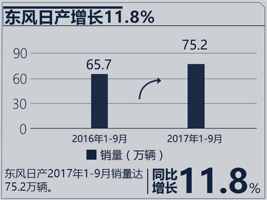 2017年东风日产的全年销量目标为108万辆。前三季度东风日产累计销售84.4万辆,同比增长8.7%,完成全年销量目标的78.1%。2017年东风日产正式进入YOUNG NISSAN3.0时代,推出了新奇骏、劲客等多款年轻化产品。此外,作为国内紧凑型轿车市场BIG 3之一的轩逸9月单月销量突破40,000辆,站东风日产