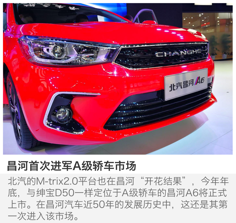 在全新绅宝D50开启北汽自主第二代产品之际,M-trix2.0平台也在昌河“开花结果”。今年年底,与绅宝D50一样定位于A级轿车的昌河A6将正式上市。在昌河汽车近50年的发展历史中,这还是其第一次进入该市场。