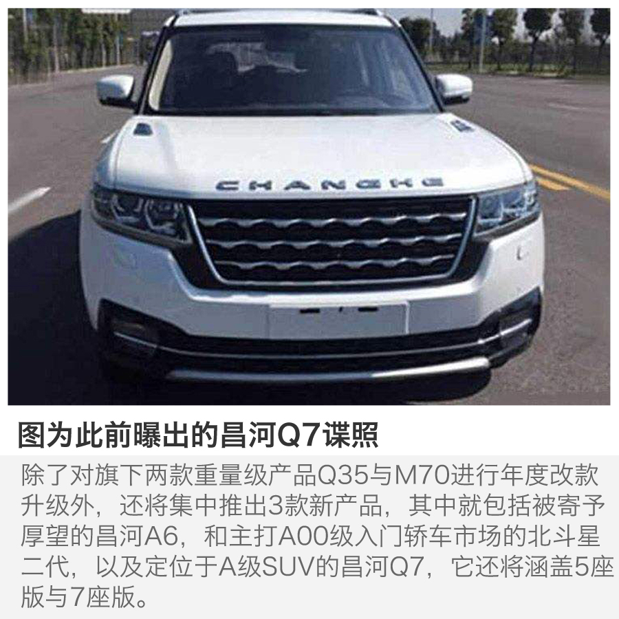 在传统能源乘用车的规划上,2017年第与2018年,昌河将会集中发起一轮新的产品攻势。除了对旗下两款重量级产品Q35与M70进行年度改款升级外,还将集中推出3款新产品,其中就包括被寄予厚望的昌河A6,和主打A00级入门轿车市场的北斗星二代,以及定位于A级SUV的昌河Q7,它还将涵盖5座版与7座版。