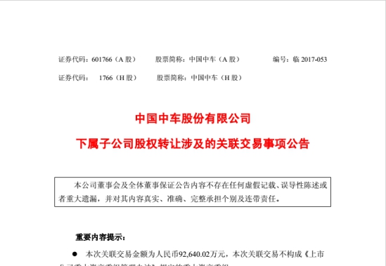 10月27日,中国中车集团(简称“中国中车”)发布公告,公司旗下全资子公司中车株洲电力机车研究所有限公司(简称“株洲所”)拟以协议转让方式,将其所持有的湖南中车电动电动汽车股份有限公司(简称“中车电动”)51%的股权转让给中国中车,转让价格为人民币92640.02万元。