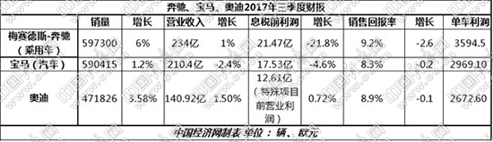 2017年第三季度业已结束,“德系三强”陆续发布三季度财报。其中,奔驰依然在各项财务指标上遥遥领先,但其息税前利润(EBIT)超过20%的跌幅值得关注。同时,一直注重盈利的宝马也在多项指标上出现下滑。