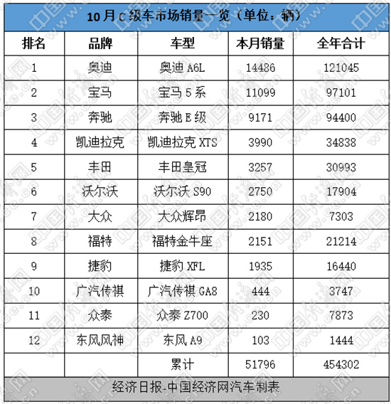 其中,奥迪A6L的表现异常抢眼,自今年5月份以来,已连续六个月蝉联C级车市场榜首,10月份销售14486辆,并稳稳地保持住月销万辆的市场能力;1-10月,累计销量超10万辆,达121045辆,与第二名宝马的销量差距继续拉大至23944辆。