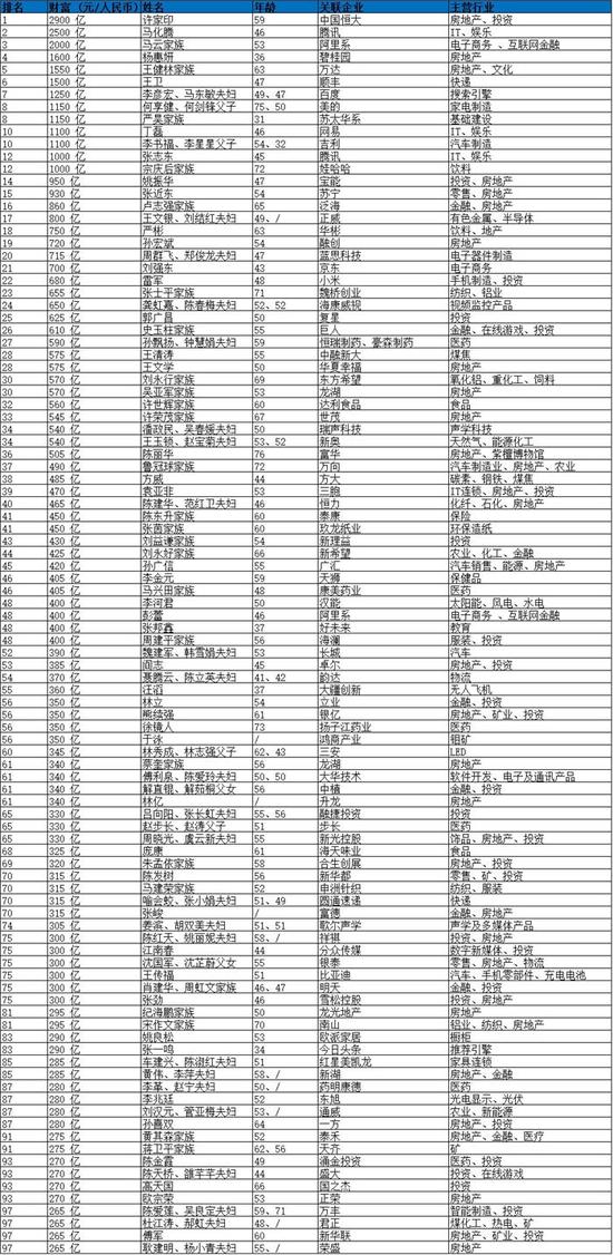 据该榜单显示,许家印以2900亿元首次登顶中国首富,2016年他的财富是780亿元,几乎是去年4倍,他是胡润百富榜19年来第12位中国首富;马化腾财富以2500亿元超过马云位列第2名,较去年增长52%;马云及其家族财富缩水2%,以2000亿元退居第3名。