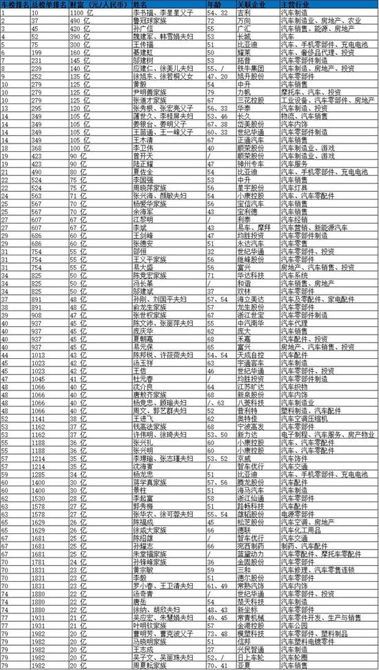 小编还整理了胡润全球富豪榜单中的汽车行业人士。今年,与汽车相关的整车、零部件、经销商、服务等相关行业中,共有83个家族进入胡润20亿元富豪榜单。其中,跻身百强的有5个。