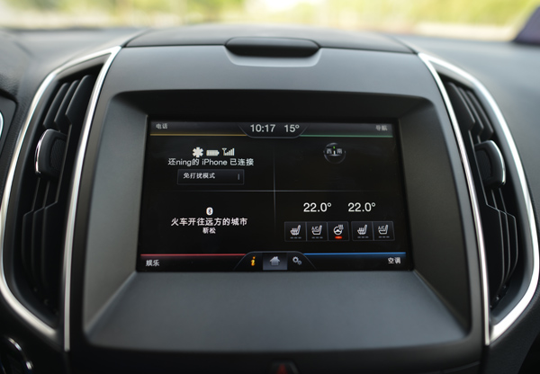 第二,在车载系统方面,长安福特金牛座搭载SYNC2车载多媒体系统,该系统在此前长安福特的多款车型上均有搭载,包括早前上市的新蒙迪欧和最近上市的锐界。该系统功能分区比较明确,依旧采用四分格显示模式,10.1寸触摸屏上,电话、导航、娱乐、车控四个层面的功能被明显地分为四块,逻辑性比较清晰。驾驶者可通过语音指令、方向盘控制键或中控区的触摸屏控制车内的各项功能、系统设定和行车信息。