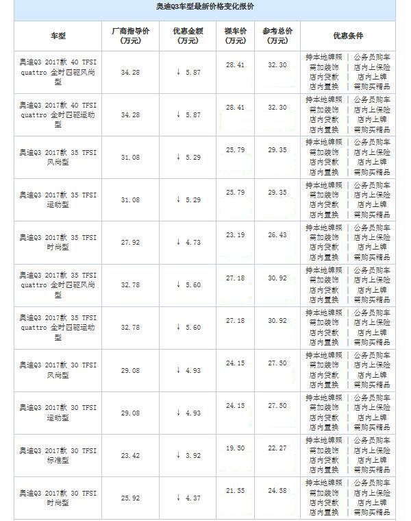 近日,本店内奥迪Q3现车销售,颜色可选,感兴趣的朋友可以到店咨询购买,详情见下表