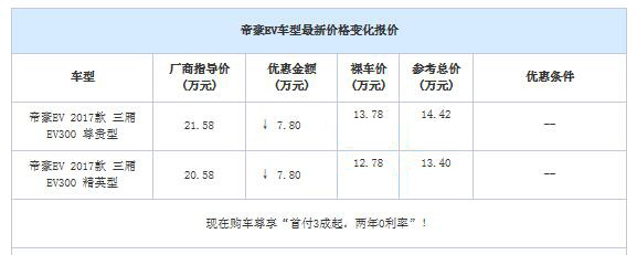 近日,本店内帝豪EV现车销售,颜色可选,目前购车部分车型可优惠6.60万元,感兴趣的朋友可以到店咨询购买,详情见下表: