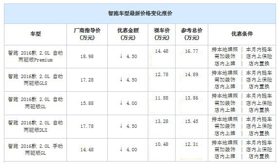 近日,本店内智跑现车销售,颜色可选,目前购车部分车型可优惠4.50万元,感兴趣的朋友可以到店咨询购买,详情见下表: