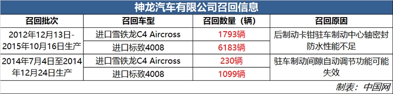 日前,神龙汽车有限公司向国家市场监督管理总局备案了召回计划。将自2019年1月25日起,召回部分进口雪铁龙C4 Aircross、标致4008系列汽车,共计9305辆。