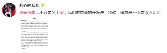 而据业内人士透露,由于销量下滑严重,华泰汽车2018年甚至撤销了销售公司,由于拖欠工资长达4个月,目前各项业务基本处于停滞状态。而此次除被曝欠薪外,另有网友通过微博透露,华泰汽车还拖欠着供应商的开发费、货款和模具费。