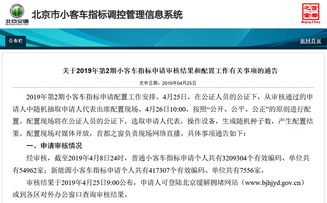 根据北京市小客车指标调控管理办公室网站北京市小客车指标调控管理信息系统显示,截至2019年4月8日24时,普通小客车指标申请个人共有3209304个有效编码、单位共有30981家;新能源小客车指标申请个人共有417307个有效编码、单位共有7556家。
