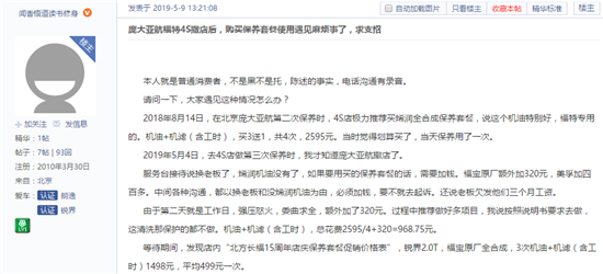 4S店退网了事,把自己“解放”了,却使得老车主在后续的维修与保养中遭遇诸多麻烦。网名为“闻香悟道读书修身”的车主吐槽道,“撤店了,承诺的套餐服务不能保证,强制加钱;为什么撤店之前不告知消费者?收了钱,现在明明不能提供的服务,应该告知消费者退款或者加强继续使用套餐。非得等我去保养时,才告诉我换老板了,以前收了钱承诺的服务,现在不能提供了”;“致电长安福特服务400电话,说庞大2019年3月撤店了,这个套餐是庞大的,跟福特公司没有关系”。