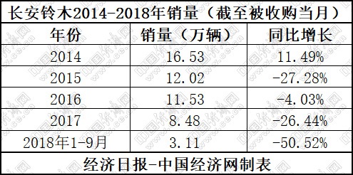 从数据上看,长安铃木在2011年的峰值销量为22万辆,在铃木退出中国之前的2015-2017三个销售年,长安铃木销量分别为12.02万辆、11.53万辆、8.48万辆,降幅分别为27.28%、4.03%和26.44%;2018年铃木正式宣布退出之前(1-9月),长安铃木累计销量为3.11万辆,同比下跌50.52%……