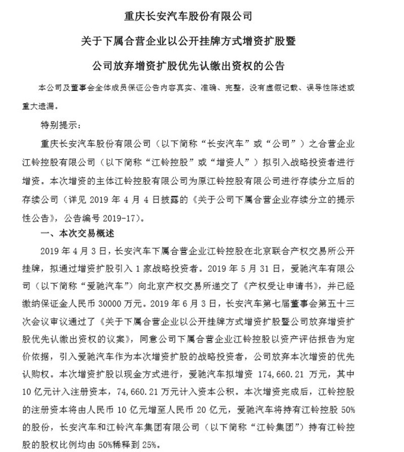 中国网汽车6月5日讯 昨晚,长安汽车发布公告称,公司下属合营企业江铃控股,拟引入爱驰汽车作为战略投资者进行增资。