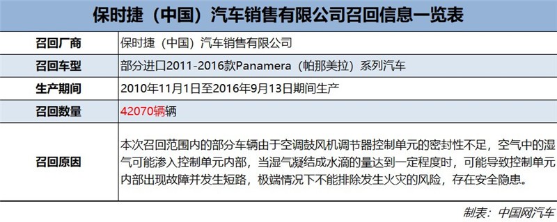 中国网汽车6月6日讯 日前,保时捷(中国)汽车销售有限公司根据《缺陷汽车产品召回管理条例》和《缺陷汽车产品召回管理条例实施办法》的要求,向国家市场监督管理总局备案了召回计划。将自2019年10月7日起,召回2010年11月1日至2016年9月13日期间生产的部分进口2011-2016款Panamera(帕那美拉)系列汽车,共计42070辆。