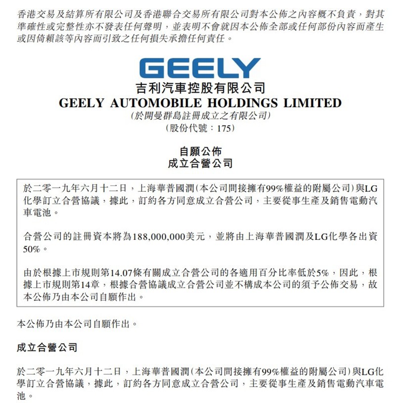 吉利表示,成立合营公司将利用双方在制造新能源汽车电池方面的实力、资源及专业知识,从而确保吉利在未来获得电动汽车电池的稳定供应。