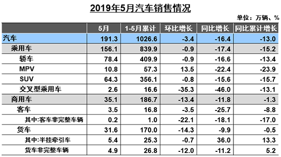 综合前5月数据,我国汽车产销分别完成1023.7万辆和1026.6万辆,产销量比上年同期均下降13%,降幅比1-4月分别扩大2和0.8个百分点。中汽协方面表示,受宏观经济下行压力,部分地区国六排放标准提前实施等因素影响,汽车产销仍处于低位运行。