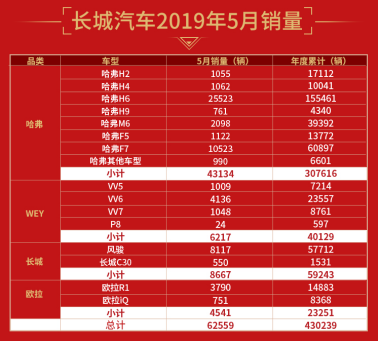 6月11日,长城汽车公布2019年5月产销数据。今年5月,长城汽车共销售新车62559辆,其中哈弗、WEY、欧拉和长城皮卡分别交出43134辆、6217辆、4541辆以及8117辆的销量成绩单。今年1-5月,长城汽车销量突破43万辆,达430239辆,同比增长5.11%。在竞争愈发残酷的市场环境下,长城汽车依旧保持了稳定的表现,用实际行动为中国汽车品牌向上发展注入强心剂。