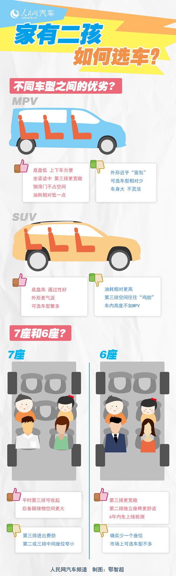 那么,对于那些“二孩”家庭来说,应该如何选择适合自身需求的车辆呢?汽车业内专家表示,“二孩”家庭买车要考虑的因素非常多,别看家里只是多了两个孩子,但出门时却因此变成了三代同行,对车辆安全性能、空间性能要求都很多,如何取舍要根据自身需求仔细衡量。因此,空间较大的,具有三排座椅的MPV车型和SUV车型更适合“二孩”家庭。