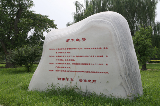 其实,危机意识已经融在了魏建军和每一个长城人的骨子里。在长城汽车徐水工厂内部,随处可见“风险路”、“生存路”和“危机路”的路牌标识。在企业发展20周年的历史节点(2010年),长城汽车更是在其总部大楼前树起了一块“前车之鉴”石,将不同类型的重大错误都刻上去以警醒自己。