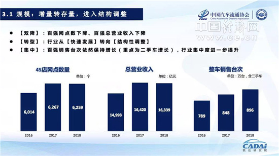 车市的“不景气”,在汽车流通领域体现得更为“激烈”。数据显示,2018年营销排名前一百的汽车经销商集团,虽然销售总量有所提升,但增量主要来自二手车业务,新车销量则出现3.9%的下滑。相较于2017年,“百强经销商集团”2018年的4S店网点数量由6267家降至6259家;总营业收入由16420亿元降至16399亿元;毛利率下滑0.6个百分点至8.5%;净利润率下滑0.5个百分点至1.6%;净资产收益率同比例下降4.7个百分点至9.4%,几乎全面下降。
