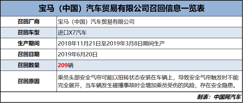 中国网汽车6月21日讯 6月20日下午,国家市场监督管理总局发布消息,宝马(中国)汽车贸易有限公司根据《缺陷汽车产品召回管理条例》和《缺陷汽车产品召回管理条例实施办法》的要求,决定自即日起,召回2018年11月21日至2019年3月8日期间生产的部分进口X7汽车,共计209辆。