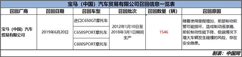 同时,宝马(中国)汽车贸易有限公司自即日起召回2012年1月10日至2018年3月1日期间生产的进口C650GT、C650SPORT、C600SPORT摩托车,共计1546辆。
