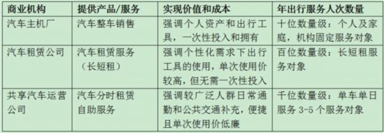 汽车主机厂、租车公司、共享汽车运营公司关于出行的价值特点如下图所示。