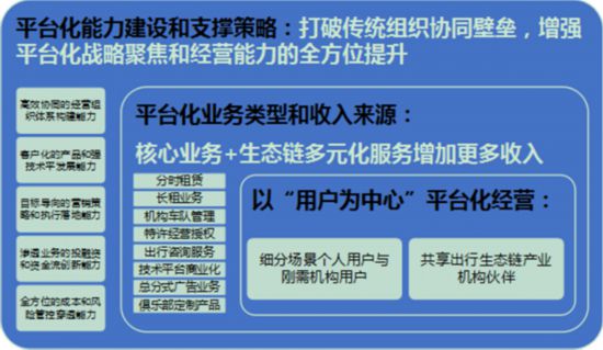 二是平台化业务类型和收入来源,除了目前分时租赁、长租外,机构车队管理、特许经营授权、出行咨询服务、IT平台应用商业化、总分式广告业务、会员俱乐部定制化产品等就是产业链收入新来源。