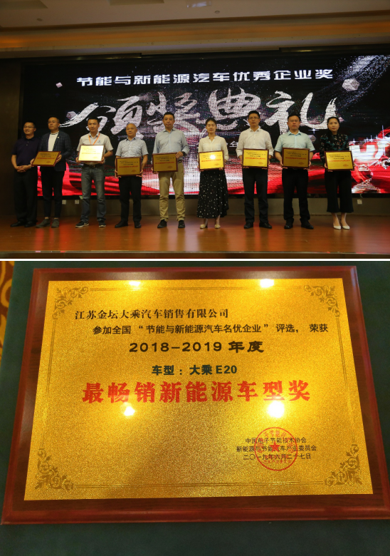 2019年6月27-28日,第二届中国(南京)新能源汽车产业发展高峰论坛盛大召开,大会邀请了政府主管部门及主流租赁运营商(含网约车)、电商平台、江浙沪等地经销商、终端用户、主机厂、物流企业、科研机构等相关产业链优秀单位共同参与本次会议。大乘汽车集团有限公司与旗下新能源车型E20凭借突出的实力双双获奖,一举拿下“最具信赖新能源汽车品牌企业奖”和“最畅销新能源车型奖”两项重要奖项。