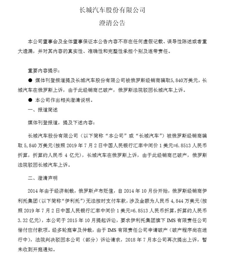 中国网汽车7月3日讯 昨晚,长城汽车发布澄清公告,针对有媒体报道提及“长城汽车股份有限公司被俄罗斯经销商骗取5,840万美元,长城汽车在俄罗斯上诉,由于此经销商已破产,俄罗斯法院驳回长城汽车上诉”一事作出回应。”