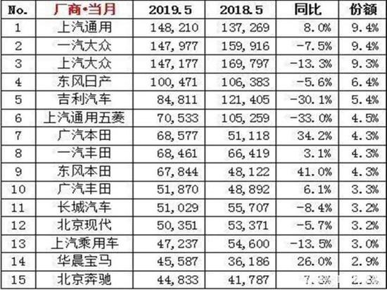 根据第三方数据机构最新公布的2019年5月份国内汽车厂商销量排名显示,国内各汽车厂商出现冰火两重天的业绩表现。