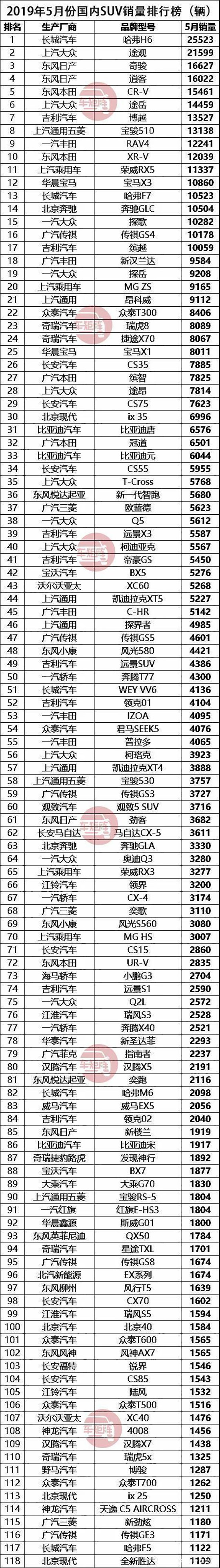 2019年5月份国内SUV销量排行